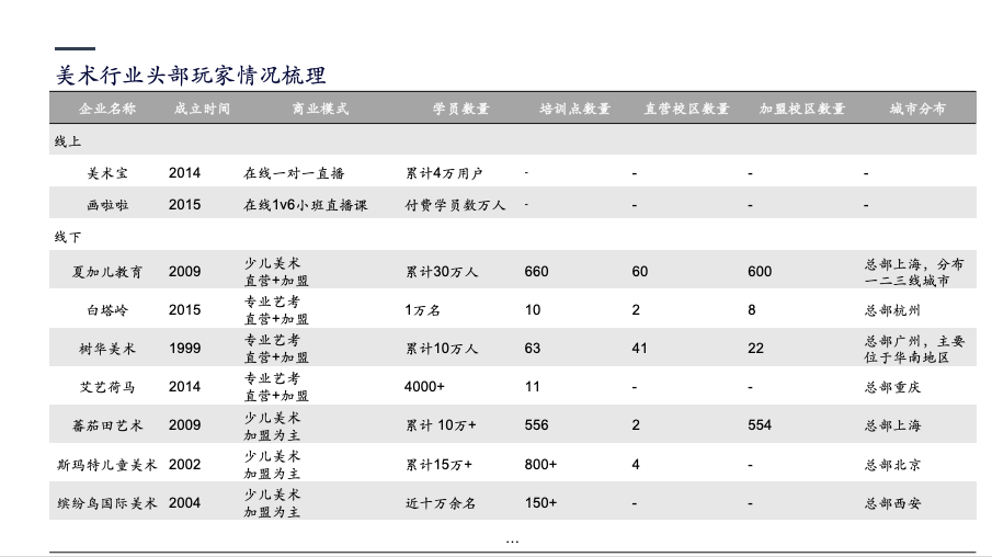 (2)傳統(tǒng)線下模式坪效、人效低,難以規(guī)模化 K12線下培訓機構(gòu)通常會采取分時教學模式,以提高單個教室的使用效率。通常在周末,一間教室會承擔數(shù)學、英語、語文、編程等多學科的教學任務(wù),教室使用效率較高。 相比之下,由于音樂線下教學往往需要專業(yè)的場地和器械,器械難以隨便搬運,因此單個教室往往只能承載一個品類的教學活動,且受限于物理空間,單個教室能夠承載的學生數(shù)量也受到極大的限制,導致線下音樂教育的坪效較低。 此外,與學科教育培訓老師主講不同,音樂教育的教學模式通常是教師示范指導,且老師需要在課堂上對每個學生的演奏動作進行糾正,通常老師一次只能面對一位學生進行演奏糾錯,且在該位同學演奏的同時,其余同學只能單純的等待,因此為了提高學習體驗,線下培訓機構(gòu)往往采用一對一模式或者4-6人小班課模式,人效普遍較低。 2.2 舞蹈行業(yè) 2.2.1 線下依舊是主流場景 不同于其他學科知識的輔導培訓,舞蹈教學過程中涉及大量的肢體運動的糾正和指導,因此在課堂上師生近距離、頻繁的交流互動是必不可少的,同時舞蹈練習對場地有較高要求,普通家庭很少有合適的場地進行練習,因此采取線上教學、家中練習的模式可行性較低。因此目前舞蹈教育的主要教學場景依舊在線下,主流機構(gòu)目前依舊通過直營和加盟模式進行全國擴張。 近年來,隨著互聯(lián)網(wǎng)趨勢不斷加深,已有玩家嘗試通過雙師課堂等技術(shù)手段提升企業(yè)拓展可能性。如小天鵝藝術(shù)中心從2018年起開始采用雙師模式,將線上教學和線下輔導相融合,提高企業(yè)拓展速度。截至2019年9月,小天鵝藝術(shù)中心旗下的七彩美育雙師課堂已發(fā)展加盟校415家。 雙師模式一方面能夠提高師資利用率,克服舞蹈教育的師資緊缺的痛點。另一方面,也可以加快拓張速度,以較輕的模式將企業(yè)品牌輸送到更廣泛的地區(qū),實現(xiàn)跨區(qū)域擴張,同時保證加盟商的師資和課程質(zhì)量,降低師資培訓難度和成本。 相比之下,舞蹈線上教育企業(yè)主要包括舞蹈教學視頻平臺、舞蹈愛好者社區(qū)以及SaaS軟件+內(nèi)容服務(wù)提供商,目前看來還很難對線下培訓格局造成顛覆性影響。 2.3 美術(shù)行業(yè) 2.3.1 缺乏標準化考核,進入門檻較低 不同于音樂培訓,除了美術(shù)藝考外,少兒美術(shù)并不存在標準化專業(yè)考試,目前美術(shù)教育的教學出口主要體現(xiàn)在兒童的繪畫作品上。因此,為了達到快速出作品的效果,目前具體的學習流程采取臨摹作品為主,缺乏具體的培養(yǎng)目標和教育理念,家長對于老師的實際教學水平也難以評斷,同質(zhì)化嚴重,行業(yè)進入門檻較低。 2.3.2 線下培訓機構(gòu)背靠八大美院,以“直營+加盟”模式持續(xù)擴張 線下美術(shù)培訓分為專業(yè)藝考美術(shù)教育和少兒美術(shù)教育。 專業(yè)藝考美術(shù)教育客單價高,多在數(shù)萬元,由于和升學直接掛鉤且專業(yè)性強,多數(shù)知名培訓機構(gòu)背靠八大美院,企業(yè)品牌塑造感強,但同時受限于師資和資源,單個公司覆蓋區(qū)域較窄,對外擴張限制較大。 少兒美術(shù)教育客單價在千元級別,相比受眾更廣,對師資、技法的教學資源的要求相對較低,但由于缺乏完善的考核體系,家長對于機構(gòu)的評價往往取決于班主任的課堂跟蹤反饋、實時教學互動、線下定期成果展示、學員風采等等綜合型教學體驗反饋,對校區(qū)管理者的運營能力要求較高。目前線下少兒美術(shù)培訓機構(gòu)大都采用加盟模式快速復制,由總部(直營校)為分校提供品牌輸出、教學教材、師資培訓和管理運營培訓等配套服務(wù)。