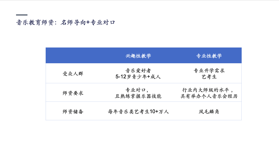 在上游硬件制造商中,鋼琴制造業(yè)由珠江鋼琴、海倫鋼琴兩大龍頭領(lǐng)銜,占據(jù)45%左右的市場份額,行業(yè)集中度較高。 在中游端,線下琴行競爭激烈,同質(zhì)化嚴重。據(jù)統(tǒng)計我國琴行數(shù)量接近30萬家,而頭部連鎖琴行的數(shù)量不過數(shù)百家,行業(yè)競爭態(tài)勢嚴重,且呈現(xiàn)極強的區(qū)域化特點,頭部公司聚焦于中國不同區(qū)域,如知音琴行,專注于長三角地區(qū),在上海和江蘇開有 24 家門店,18 年營收 4.52 億元,凈利潤 1723 萬元。 近年來,互聯(lián)網(wǎng)等技術(shù)發(fā)展對于音樂行業(yè)的改造體現(xiàn)在兩個方面: 一是通過智能硬件切入行業(yè)上游,打通上游硬件銷售和中游教學環(huán)節(jié)。 例如The One智能鋼琴,通過智能硬件+教學軟件組合來輔助教學,取代部分老師的功能,降低樂培機構(gòu)對老師的依賴程度,不過目前在這種模式下,硬件的銷售依然占據(jù)80%左右的營收; 二是創(chuàng)造性的誕生了在線陪練模式。 這種模式的誕生源于在音樂學習過程中,“10000小時法則”所要求的大量練習以及家長專業(yè)指導能力缺乏的客觀現(xiàn)實。同時,在線陪練模式將主教老師和陪練老師區(qū)分開,相比之下陪練老師的要求相對較低且流程較為標準化,使得規(guī)模化較為容易,此類公司代表包括VIP陪練、快陪練等,其中VIP陪練目前單月營收已突破億元,驗證了該種模式的可行性和規(guī)模性。 2.1.3 音樂教培行業(yè)發(fā)展痛點 (1)大師導向,師資難以復制 音樂教育對師資的要求高,即使是興趣性教學,也需要教師專業(yè)對口且熟練掌握樂器技能,而對于專業(yè)升學教學,更是要求大師師資,一師難求。音樂屬于天賦型學習,一般來看大師師資是無法通過短期標準化培訓獲取的,而即使是專業(yè)對口的學生,也需要長時間的練習才能夠達到較好的技能水平,機構(gòu)獲取師資的難度遠超K12培訓行業(yè)。