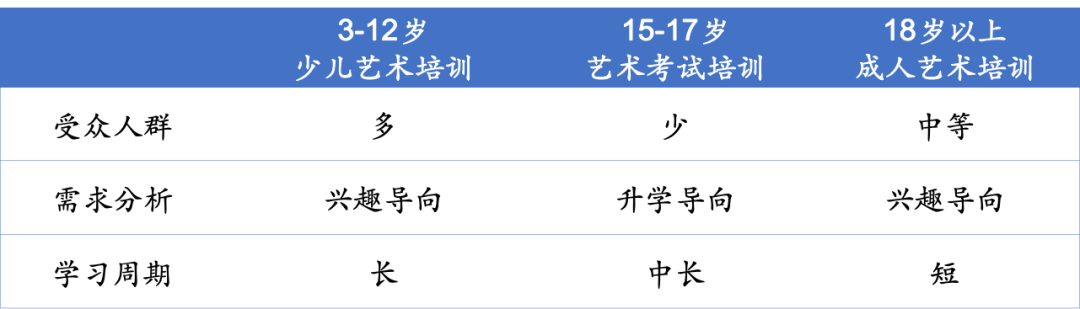 而在藝術(shù)考試層面則進一步下沉,從2017年開始,不少省市如江蘇、河南、山東將音樂、美術(shù)納入中考范圍,明確規(guī)定音樂、美術(shù)考試分數(shù)將計入中考總分,自此藝考不再是少數(shù)藝術(shù)特長生的另辟蹊徑,而正式納入普通生升學考試的體系之中,藝術(shù)教育的剛性需求進一步得到提升。 1.2 消費升級驅(qū)動 從藝術(shù)教育的需求來看,針對不同年齡段的學生,主要分為少兒藝術(shù)培訓、藝術(shù)考試培訓和成人藝術(shù)培訓,其中少兒藝術(shù)具備受眾基數(shù)大、學習年限長等特點,是藝術(shù)教育培訓的消費主體。