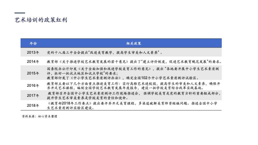 藝術(shù)教育的“在線”變革隨著85后成為新生代家長,教育觀念的轉(zhuǎn)變以及消費能力的提升促使素質(zhì)教育在近幾年蓬勃發(fā)展,具有千億市場潛力。然而,多年來藝術(shù)教育一直呈現(xiàn)“大市場、小作坊”的行業(yè)格局,藝術(shù)培訓機構(gòu)良莠不齊、競爭激烈, 且呈現(xiàn)極強的地域性,藝術(shù)教育機構(gòu)的標準化和規(guī)模化復制一直難以找到合適的解決方案。 近年來,K12教育培訓正式走上在線化的道路,一對一直播、小班課、大班課、雙師模式等諸多在線模式都得到驗證,一定程度上解決師資不足、課程內(nèi)容非標等問題,那么“在線化”是否會成為藝術(shù)教育規(guī)模化的答案?本文將從需求分析、行業(yè)現(xiàn)狀、在線化變革以及未來發(fā)展趨勢四個方面分析藝術(shù)教育的發(fā)展和未來。 1、藝術(shù)教育:傳統(tǒng)需求的新煥發(fā) 和STEM不同,藝術(shù)教育的發(fā)展更早一些,90年代的文化宮承載了大批孩子藝術(shù)學習的需要。且與目前的編程或者數(shù)學思維等“新學科”不同,目前85、90后的家長在其成長階段或多或少接觸過一些藝術(shù)教育,對此有一定的基礎(chǔ)認知,家長再教育成本相對較低。在政策紅利和消費升級的雙重環(huán)境下,藝術(shù)教育這一傳統(tǒng)需求迸發(fā)出新的生機。 1.1 政策紅利初現(xiàn) 自 2013 年以來,國家關(guān)于進一步推進在校學生藝術(shù)素質(zhì)測評、加強學校美育工作、支持和鼓勵民辦教育等政策相繼出臺,強調(diào)美育課程應(yīng)在課內(nèi)教育中應(yīng)當占據(jù)一定比重。